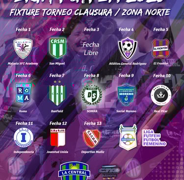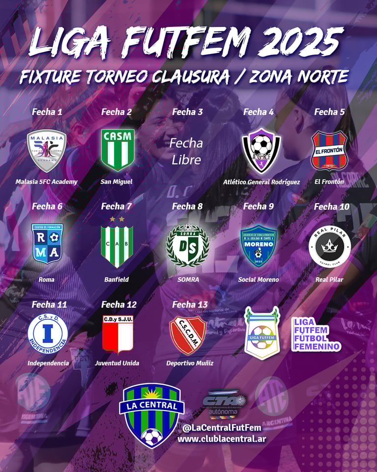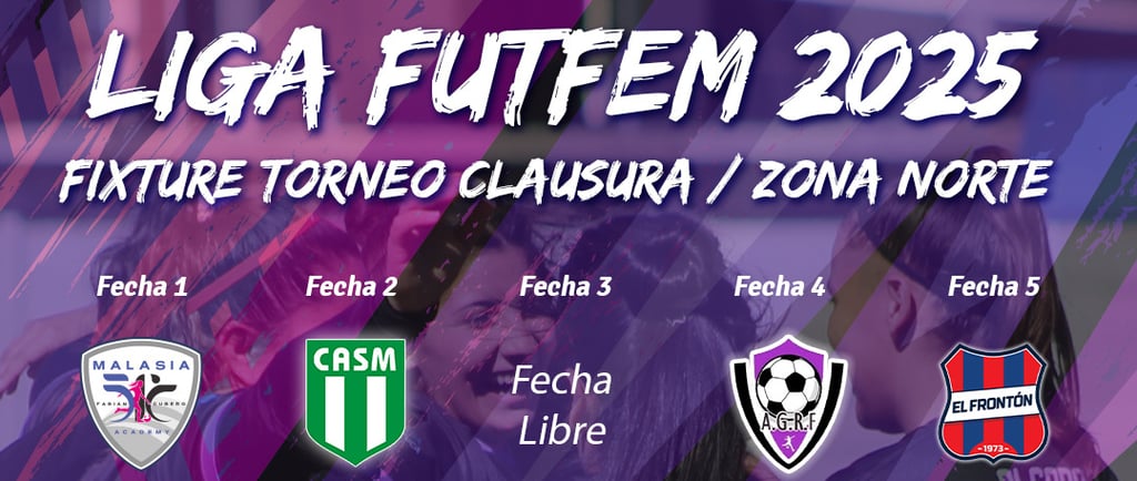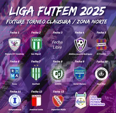 La Liga FutFem publicó el fixture del torneo que cerrará el año 2025. Aunque de un torneo al otro solo cambia la localía, en el caso de zona norte es distinto. Entre los clubes que no participan del Clausura están Atlético Pilar y San Lorenzo de Muñiz, pero sus lugares han sido ocupados por El Frontón y Deportivo Muñiz. Vale destacar que con el retorno del club oriundo de San Andrés de Giles (que en el Apertura disputó la zona oeste), en este grupo se encuentran los dos finalistas de la categoría Reserva, ya que tanto Malasia como El Frontón disputaron la final, siendo éstas últimas las ganadoras del torneo. En el caso de Deportivo Muñiz, se trata de su debut en la Liga FutFem.